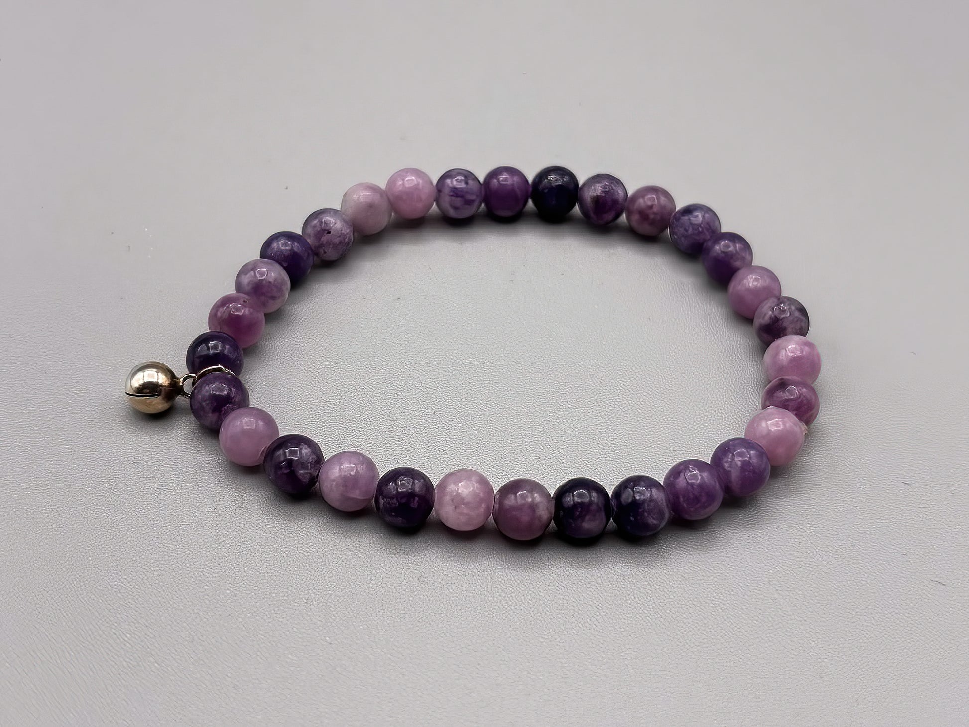 6mm Lepidolite Beaded Bracelet with Sterling silver chime charm, size 7 1/2 inch