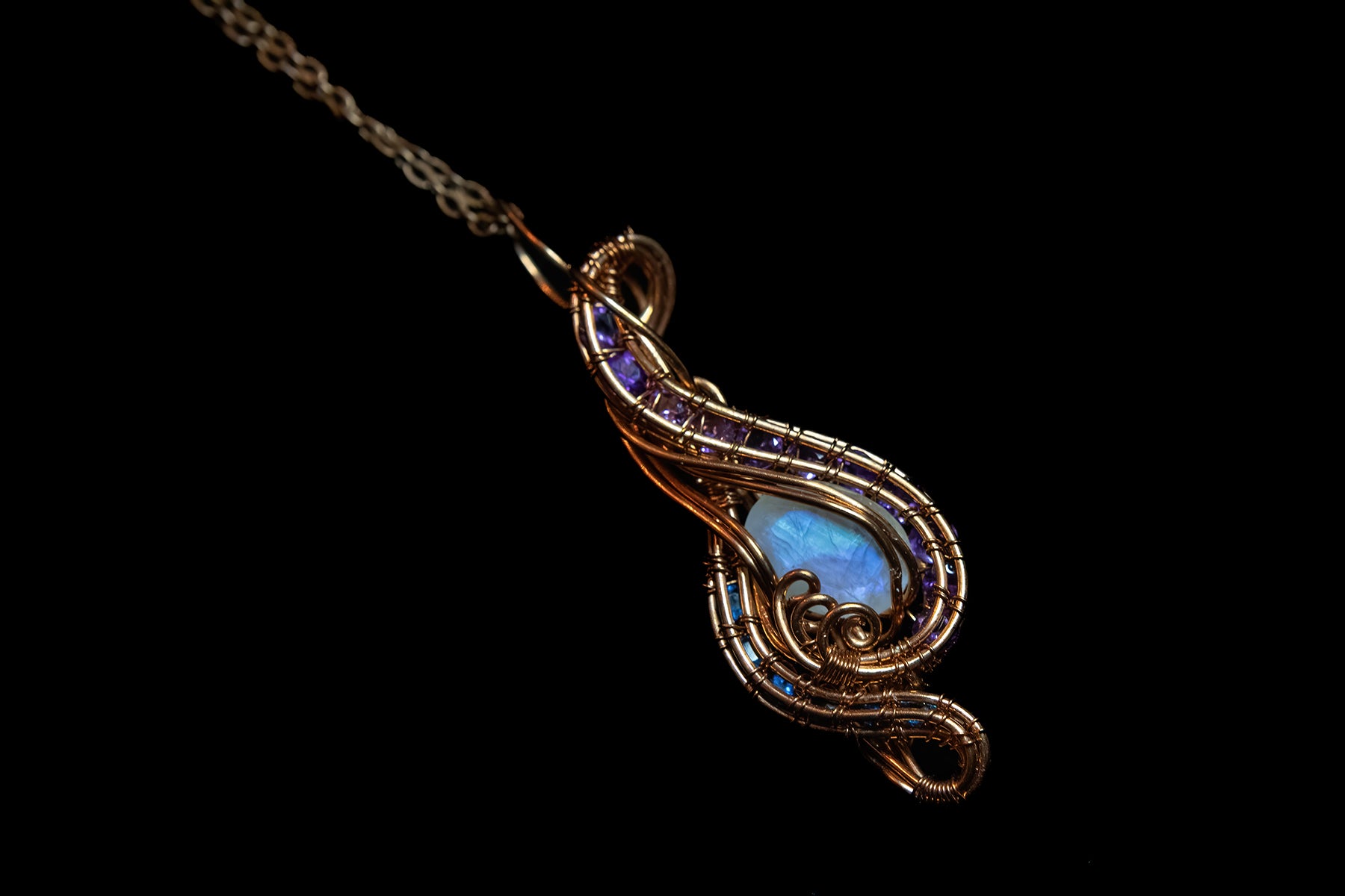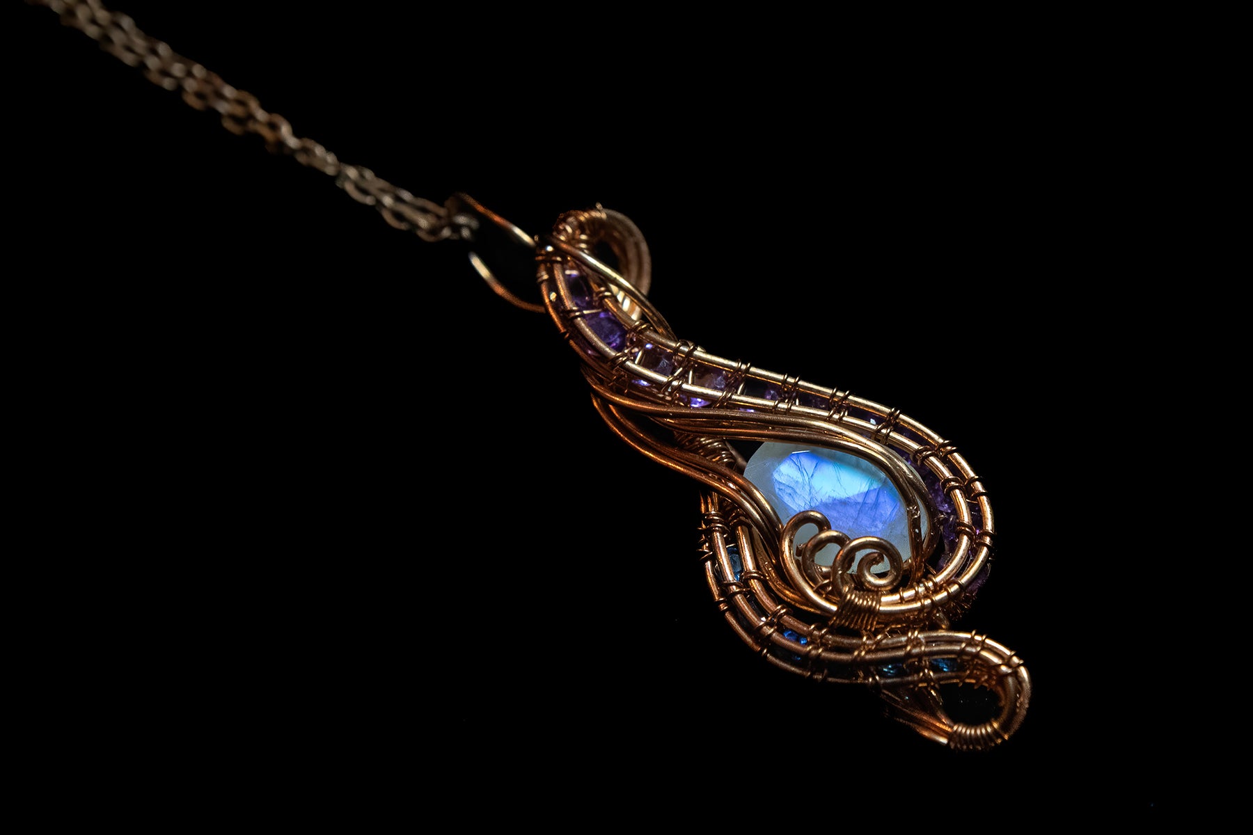 Blue Flash Faceted Moonstone with Apatite and Amethyst Facets in Fine Copper