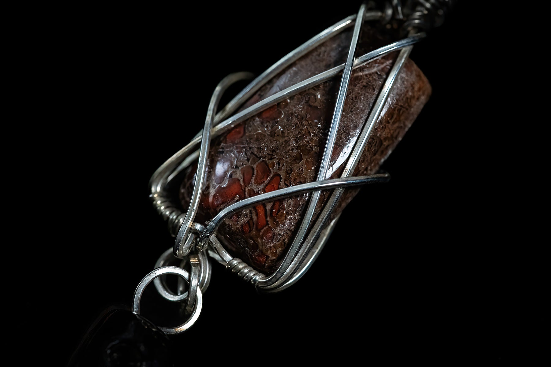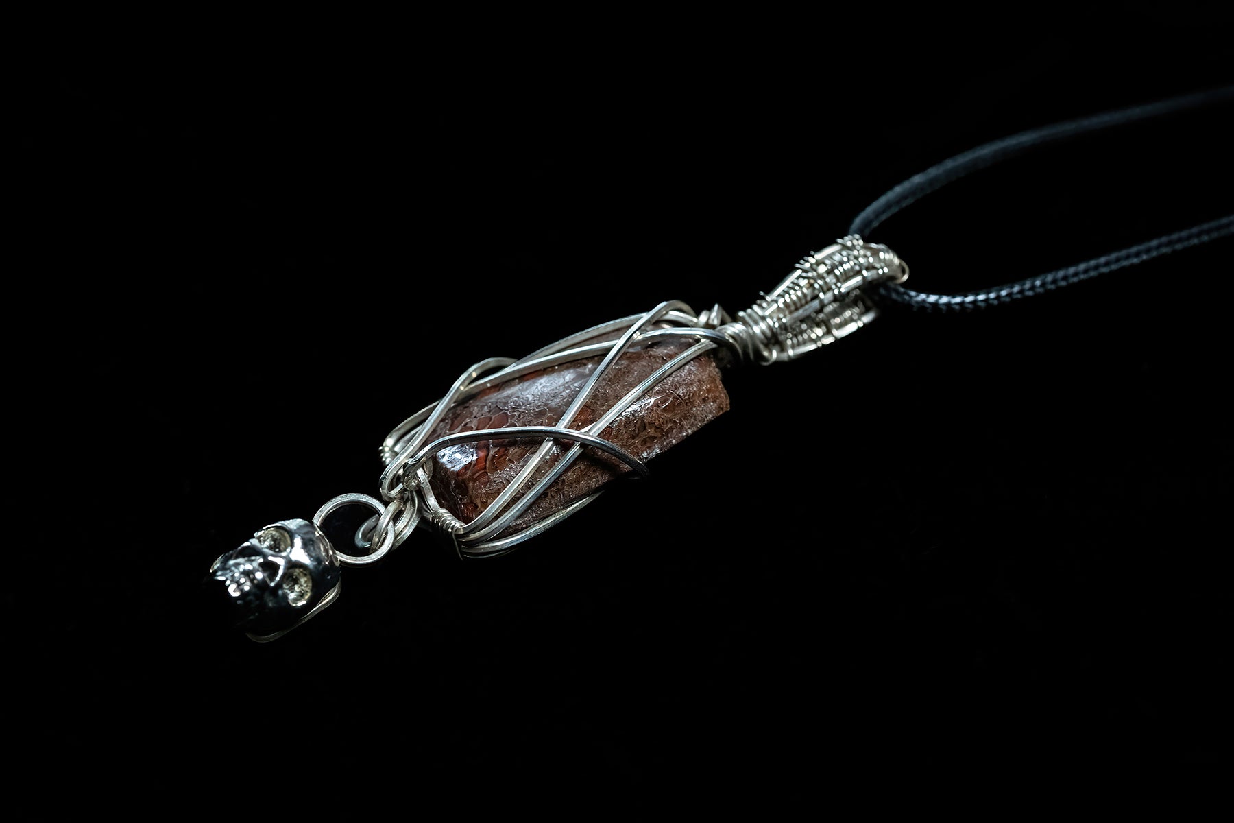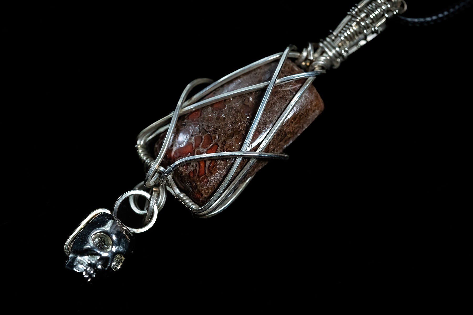 Unleash your inner explorer with our Dinosaur Gem Bone necklace! Crafted with .925 Sterling Silver and a Stainless Steel skull accent, this unique piece includes a leather necklace and features a red agatized dino bone, likely containing hematite inclusions. Perfect for the curious and adventurous.