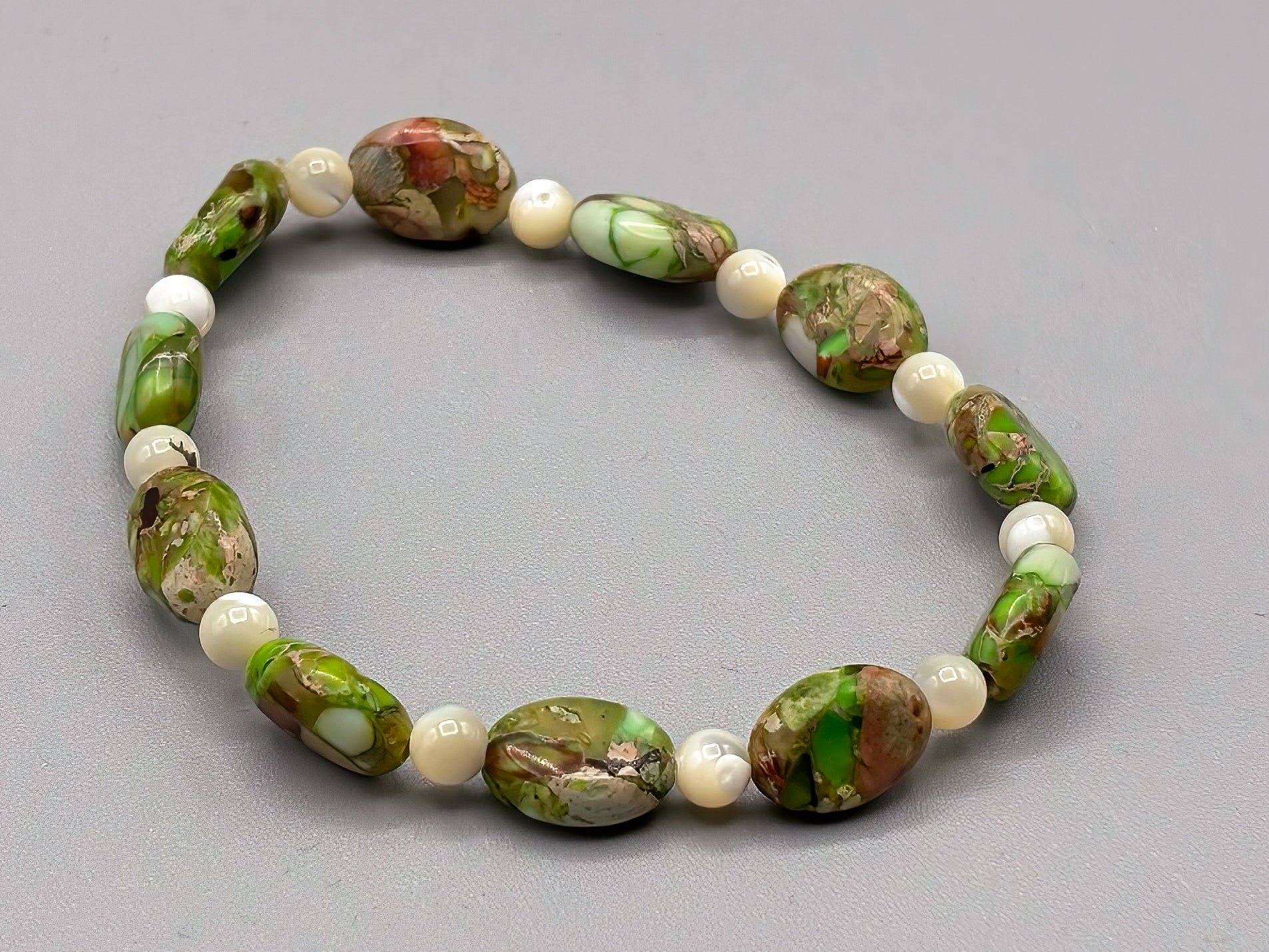 Green Imperial Jasper and Shell Beaded Bracelet, 7 1/2 inches