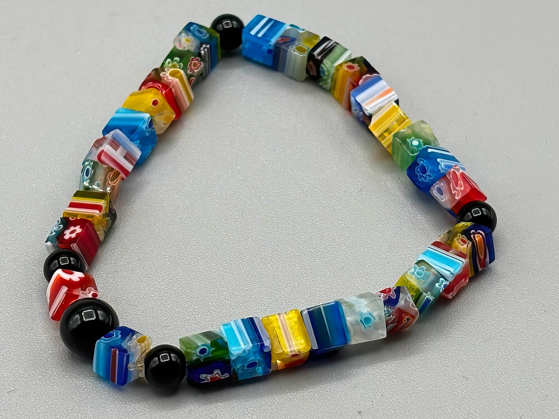 Handcrafted with vibrant millefiori glass beads, this 7 1/2-inch bracelet brings timeless elegance to any wrist. Each square bead features intricate patterns and rich colors that catch the light beautifully, making it a striking accessory for everyday wear or special occasions. The comfortable fit and quality craftsmanship ensure lasting appeal. Perfect as a gift or personal treasure.