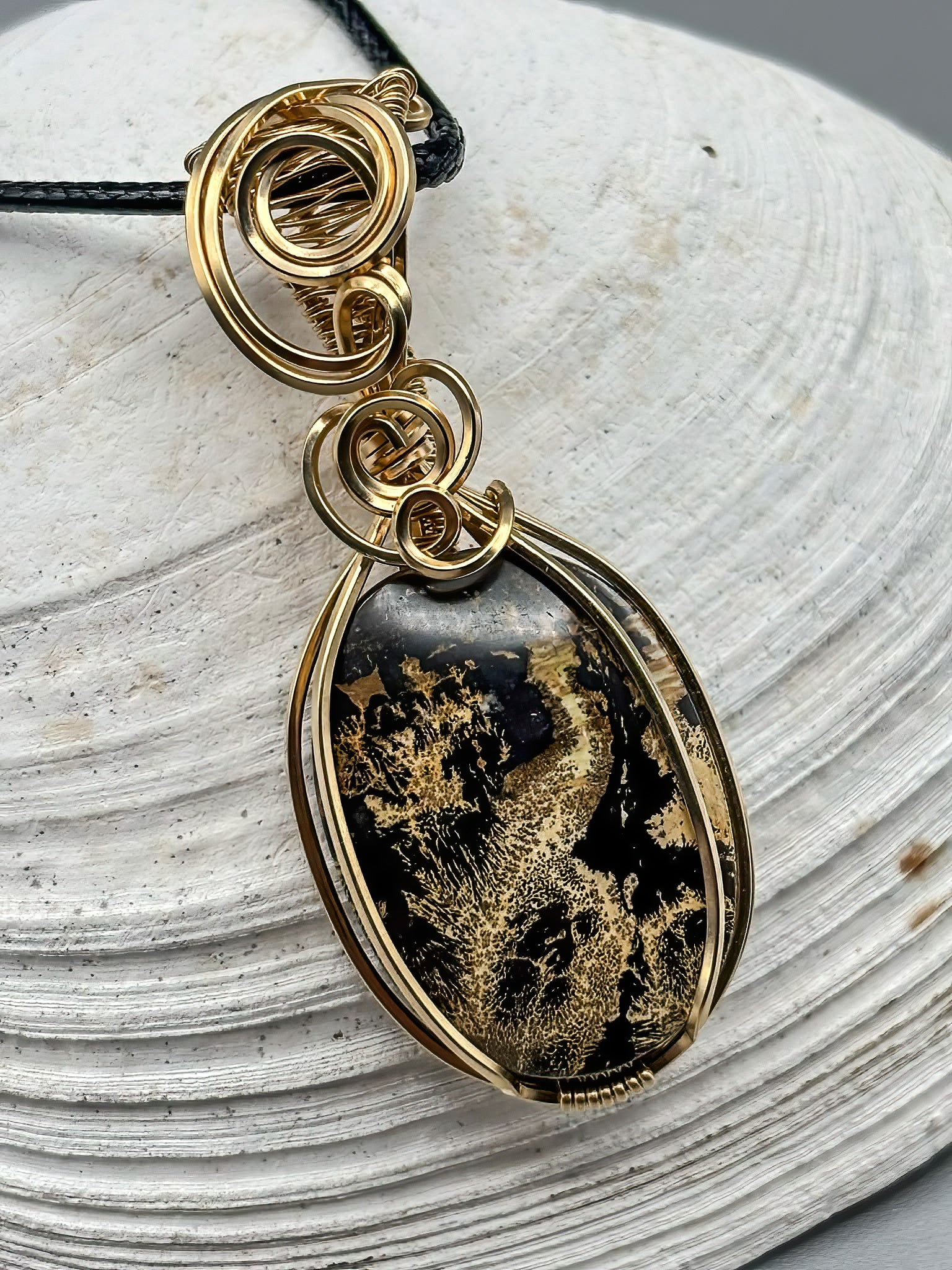 Picture Jasper Pendant in 14K Gold Filled Wire Showcase the natural beauty of earth-toned Picture Jasper with this handcrafted pendant, wrapped in durable 14K gold-filled wire. Each stone features unique landscape-like patterns, making your piece truly one-of-a-kind. Gold-filled construction offers the luxury look of solid gold at an accessible price point, resisting tarnish and wear for lasting elegance. Perfect for layering or wearing solo, this pendant brings organic sophistication to any collection. A timeless accessory that celebrates nature's artistry.