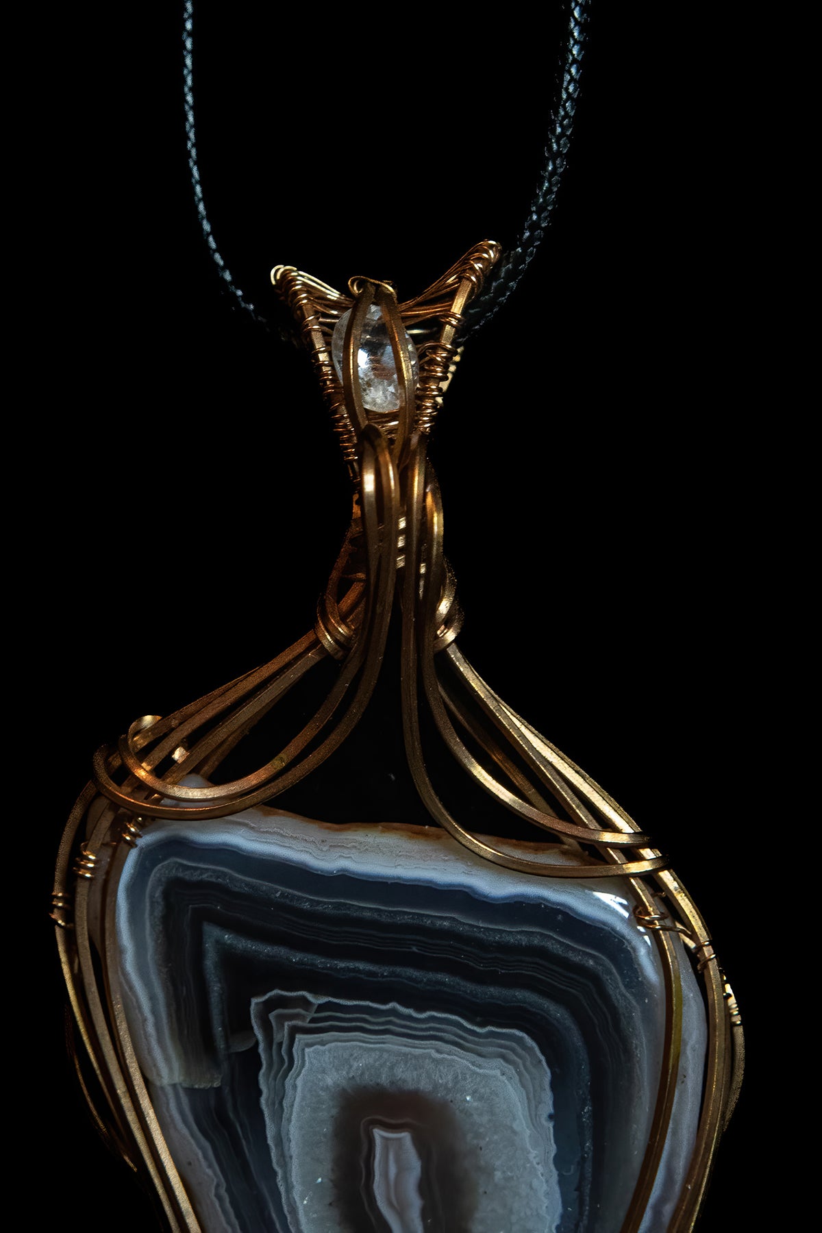 Unleash your inner goddess with our Pink and Purple Botswana Agate and White Topaz Pendant! This breathtaking piece features a stunning color combination and is carefully wrapped in fine copper for a touch of elegance. Complete the look with our included leather necklace. Feel empowered and alluring.