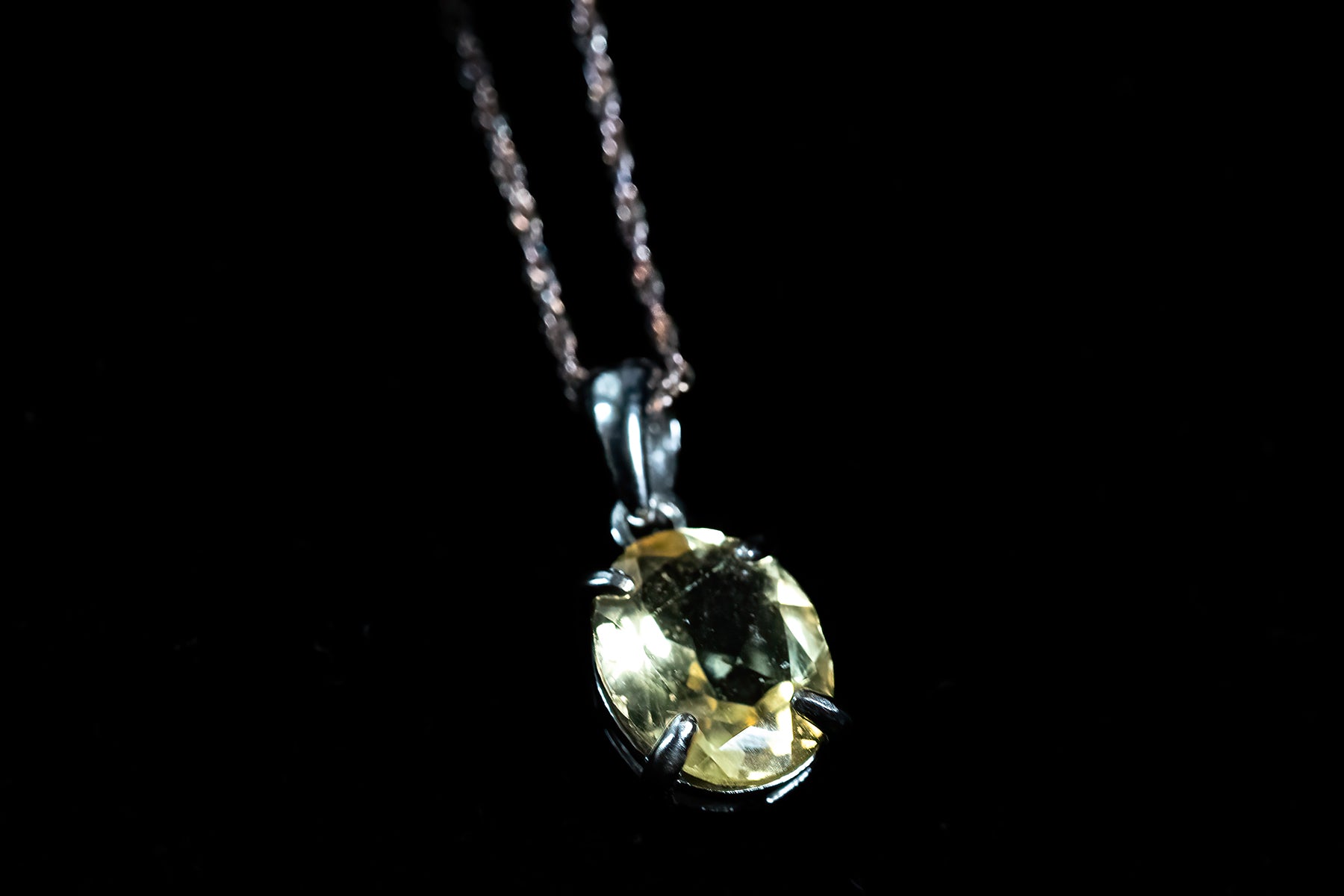 Indulge in luxury with our Pretty Little Citrine Oval Facet necklace. Crafted with a stunning citrine gemstone, set in sterling silver and delicately hung on a silver chain, this piece radiates elegance and sophistication. Elevate your style and add a touch of refinement to any outfit with this must-have accessory.