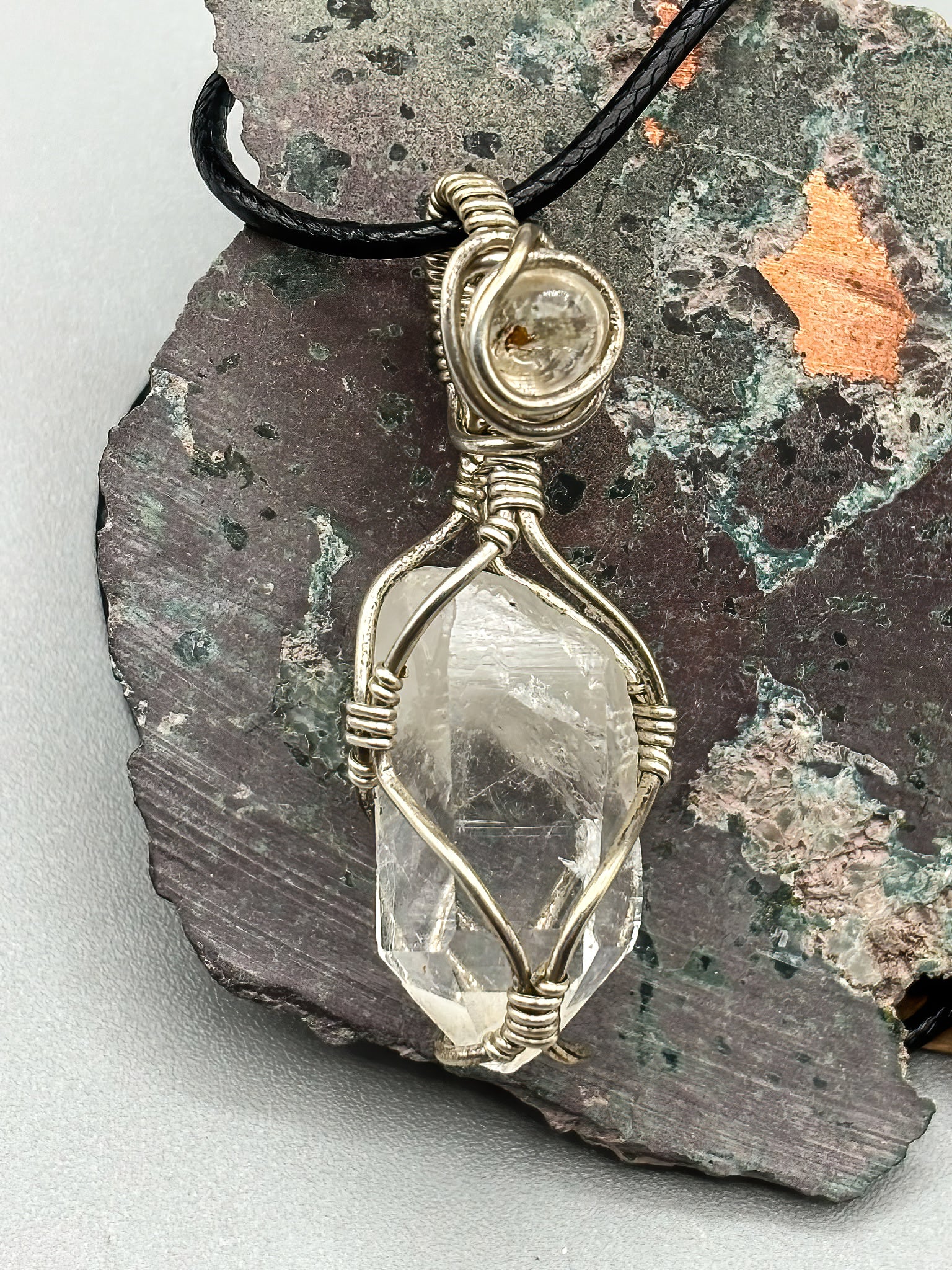 Self Mined Arkansas Quartz Point accented with Firefly Quartz from Brazil, wrapped in sterling silver