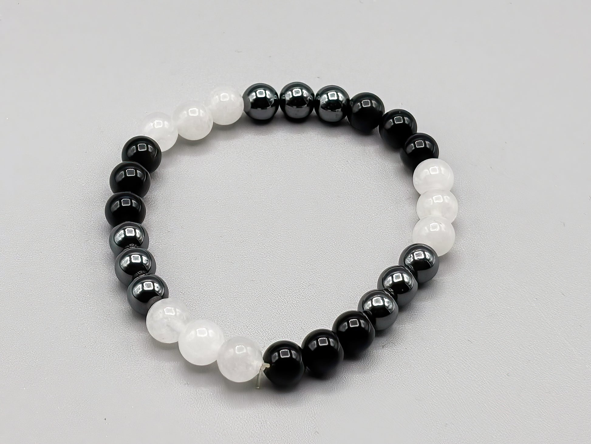 Harness the combined power of three protective stones with this carefully crafted bracelet. Clear quartz amplifies positive energy and intention, hematite grounds and stabilizes your spirit, while black obsidian shields against negativity. Each stone is thoughtfully selected for its metaphysical properties, creating a harmonious blend designed to support your wellbeing throughout the day. Sized at 7 3/4 inches for a comfortable fit, this bracelet makes a meaningful addition to your spiritual practice or a thoughtful gift for someone seeking balance and protection.